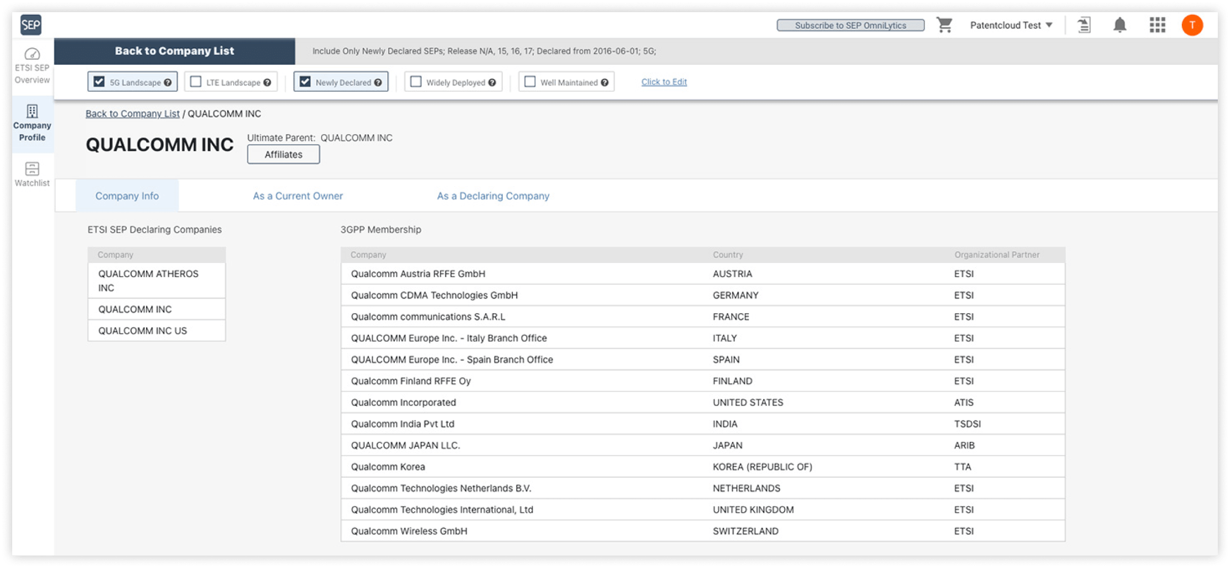 企業とその関連企業のSEPに関する基本情報、および3GPPメンバーのステータスを取得できます。